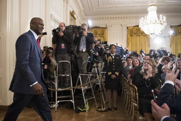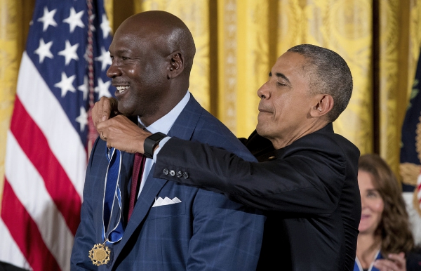 “这次授勋者中拥有各行各业的人员,包括创新者、艺术家、公务员等等,比如那个来自电影《空中大灌篮》的著名演员,”奥巴马如是说道。显然,他提到的正是迈克尔·乔丹。