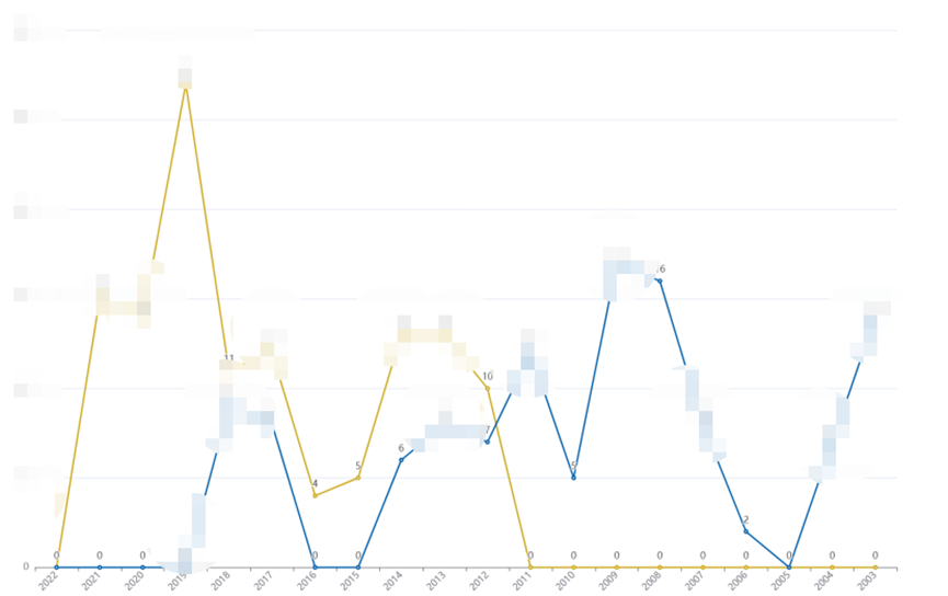 *数据来源知产宝专利检索库,蓝线为某传统代理巨头,黄线为中生代代理机构。为避免对号入座,隐去部分数据信息。