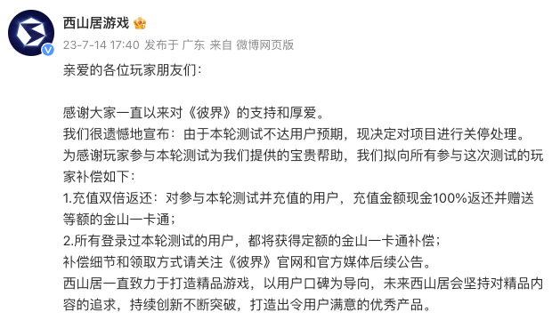 7月14日,西山居游戏官方微博发布公告称,由于《彼界》本轮测试不达用户预期,现决定对项目进行关停处理。