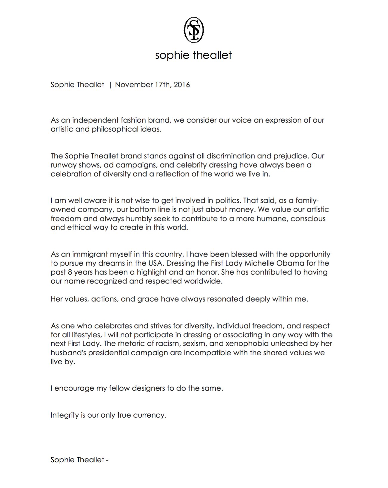 “作为一个拥护种族平等、个人自由并且尊重不同形式生活形态的人,我不会参与任何有关下一届美国总统夫人的形象工作。因为她的丈夫在竞选总统时表现出的种族、性别歧视以及仇外倾向,和我们的价值观完全不符。”Sophie Theallet在声明中说。