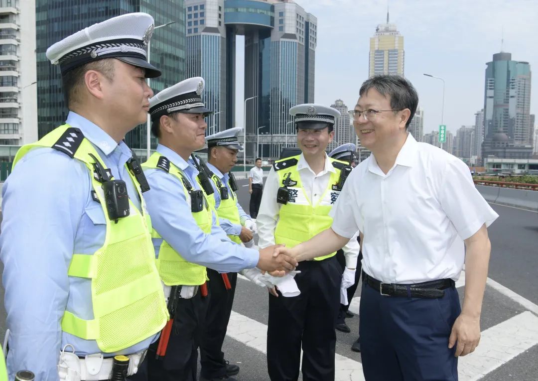 烈日当头,为保障城市交通正常运转,高架执勤民警承受着五六十摄氏度的地表温度,坚守岗位、现场执勤。陈吉宁来到南北高架延安东路立交,亲切慰问市公安局交警总队高架支队执勤民警代表,关切询问工作时长、执勤安排、应急处置以及后勤保障措施。他说,大家冒着高温酷暑坚守在排堵保畅第一线,工作十分辛苦、很不容易。人民警察这份职业代表着奉献和付出,希望大家不忘初心使命,持续提升业务本领,不断优化交通组织,更好服务人民群众。市领导叮嘱有关负责同志,要从基层一线民警实际需求着手,认真倾听想法建议,确保各项防暑降温举措更有针对性、更加精准直达,让大家始终以良好状态守护超大城市安全有序。