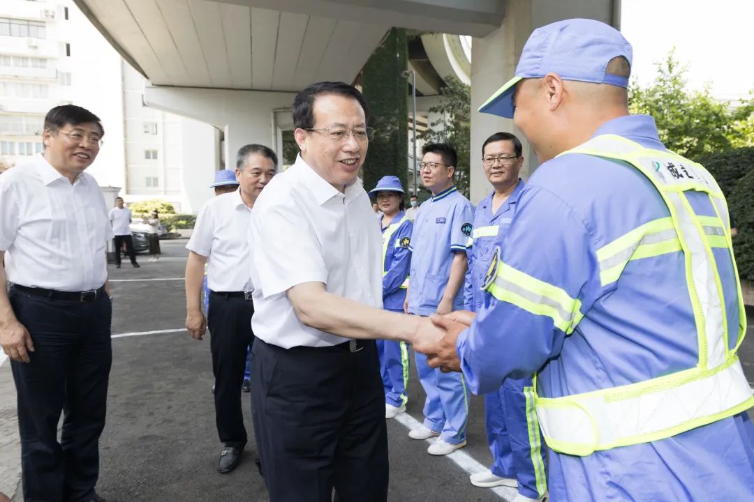 在陆家浜路上的上海欣望环卫公司,环卫工人们正准备外出进行路面保洁。市领导快步向前,与大家一一握手,感谢大家的辛勤付出。“高温酷暑,环卫工人压力大、任务重,你们的劳防用品发了吗?高温补贴到位了吗?”龚正仔细询问了解。在听取大桥班组工作及市劳模邹富建创新工作室情况介绍后,市领导赞扬他们的爱岗敬业精神,要求公司负责同志继续保障好一线人员工作条件,提高机器使用率,优化工作流程,合理安排员工作息。