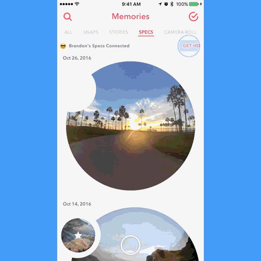 拍摄好的视频会通过 WiFi 或者蓝牙同步到你的手机上,而且很好玩的是,用 Spectacles 拍出来的视频,是圆的。。。