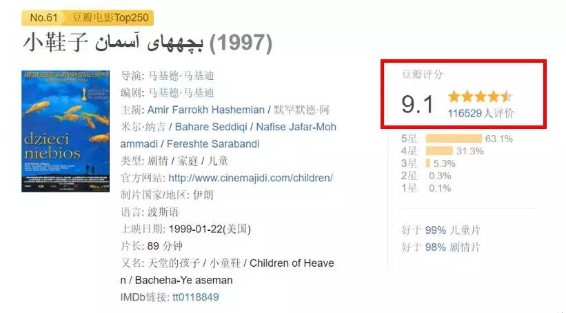 其中1999年马基德·马基迪的《小鞋子》,甚至拿到了奥斯卡最佳外语片的提名,以9.1的高分盘踞豆瓣电影Top250的第61位。