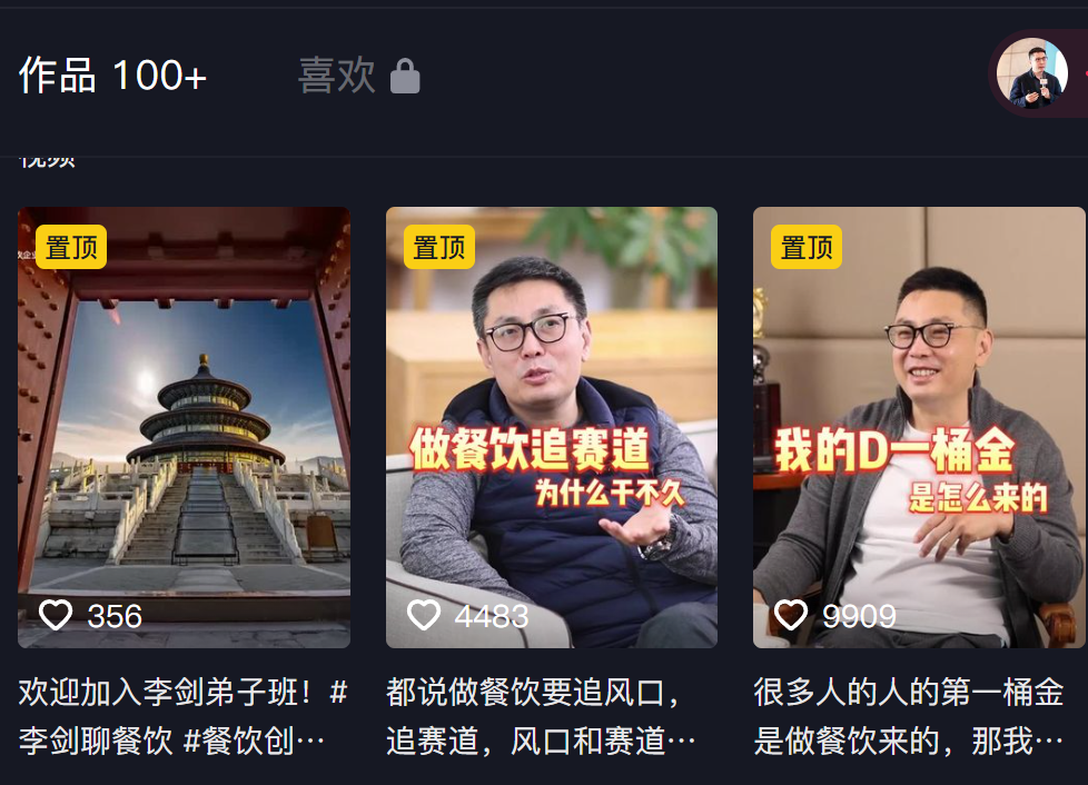 经过两年运营,如今他的抖音已有10万粉丝,置顶的三条内容中,一条是欢迎粉丝加入“李剑弟子班”,一条是忆往昔峥嵘岁月“第一桶金是怎么来的”,一条是方法论输出告诉大家餐饮不能“追风口”。以上三种内容,完成吸引粉丝、成为导师和吸引代理的目的。