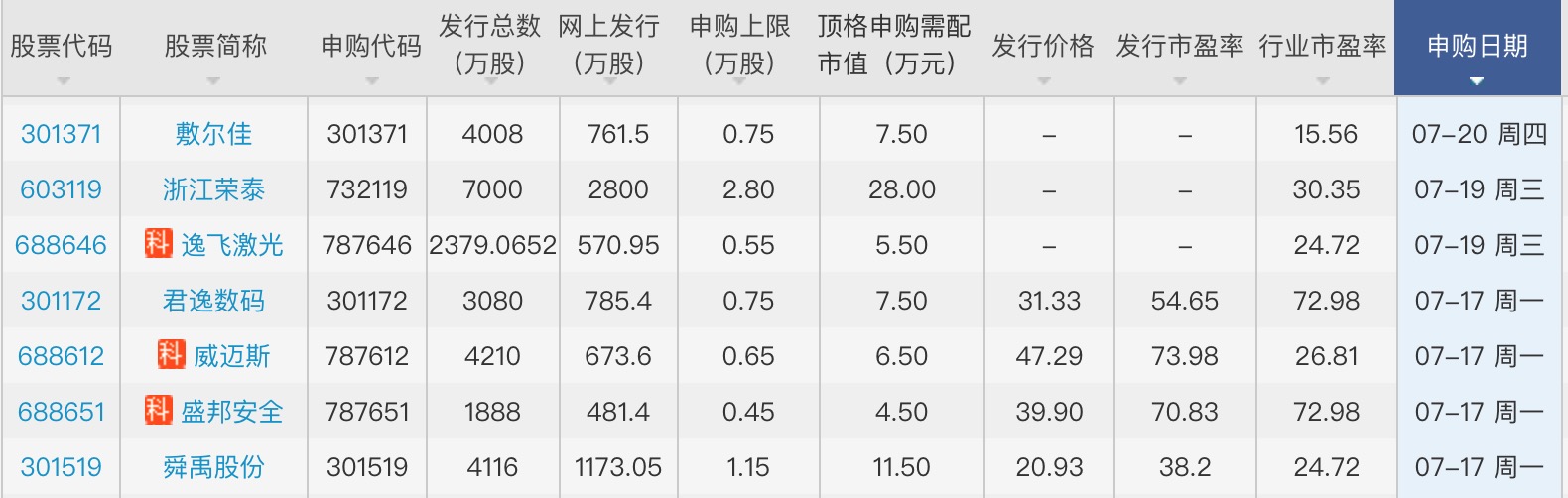 7月19日周三,打新的投资者也有两只股票可以申购:科创板公司逸飞激光(688646.SH)和浙江荣泰(603119.SH)。逸飞激光的申购上限为0.55万股,公司从事精密激光加工智能装备研发、设计、生产和销售,其圆柱全极耳锂电池激光焊接设备及其全自动组装生产线国内市占率第一。浙江荣泰的申购上限2.8万股,主营耐高温绝缘云母制品,在新能源汽车和家用电器云母应用领域市占率较高。