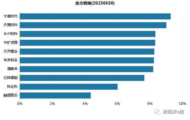 其重仓股区间表现情况表明,今年二季度股价表现最差的前三只重仓股分别为华友钴业、亿纬锂能、融捷股份,累计分别下挫16.16%、12.97%、10.61%;而表现最好的前三只重仓股分别则是璞泰来、中矿资源、永兴材料,分别上涨了11.78%、2.81%、2.52%。