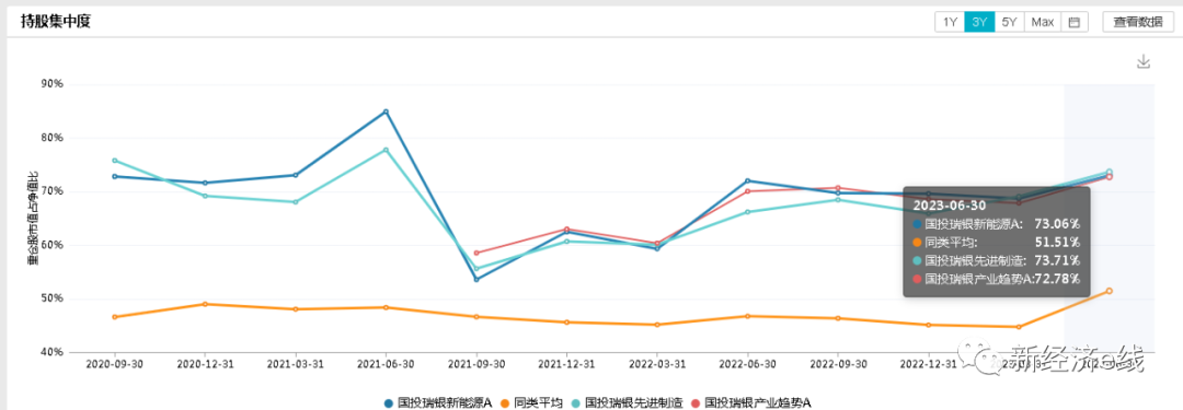 就持股集中度而言,国投瑞银新能源在2021年上半年触及84.95%的最高点之后,于同年第三季度末降至53.63%的历史位位。此后两个季度里,其持股集中度分别抬升至62.53%和59.37%。等到2022年上半年,这一数字再度大幅提高至72.05%,并在此后的三个季度里略降至70%以下。但进入2023年第二季度,其持股集中度再度突破70%至73.06%,远远高于同类平均的51.51%。