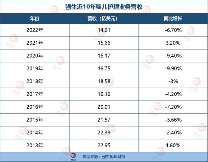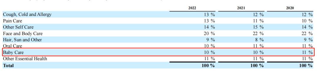 此外,就近三年来看,婴儿护理业务占强生健康消费品部门总营收的比重也在逐年下滑。据Kenvue招股书显示,截止2022年末,婴儿护理占总营收比重仅为10%,而在十年前该比例为15%。