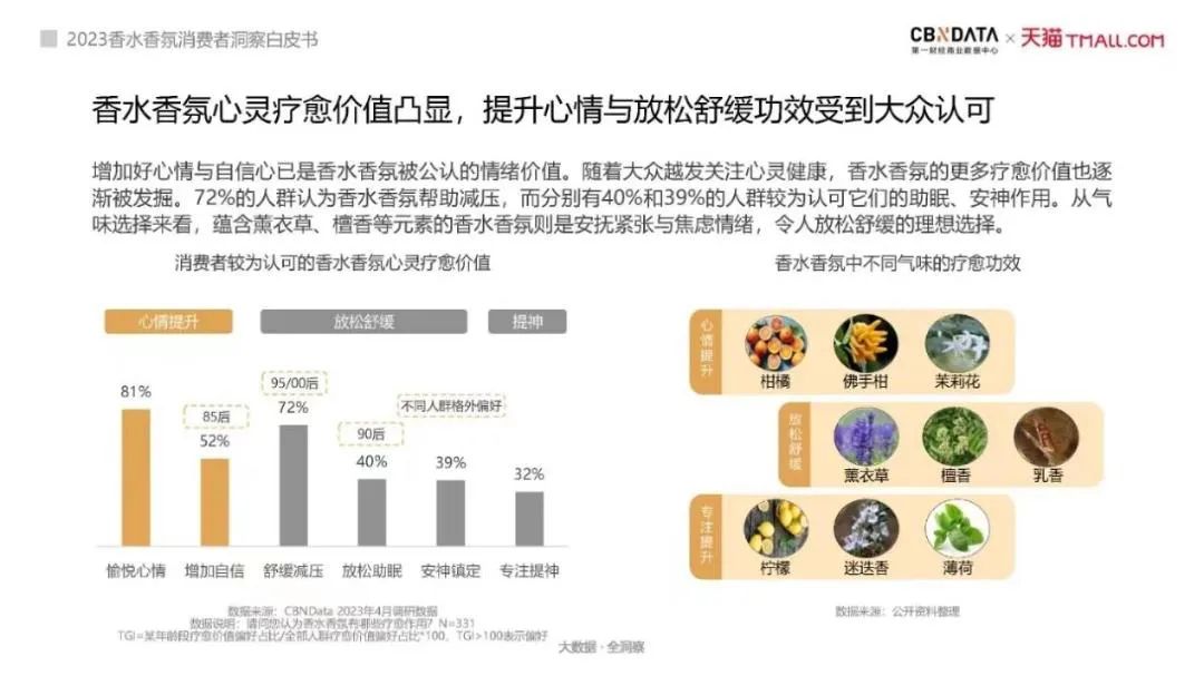 《2023年香水香氛消费者洞察白皮书》显示,72%的人群认为香水香氛帮助减压,而分别有40%和39%的人群认可它们的助眠、安神作用。可以看出,香水香氛的心灵疗愈价值凸显,提升心情与放松舒缓功效受到大众认可。① 半亩花田打造入魂香氛,启动专利情绪香氛项目