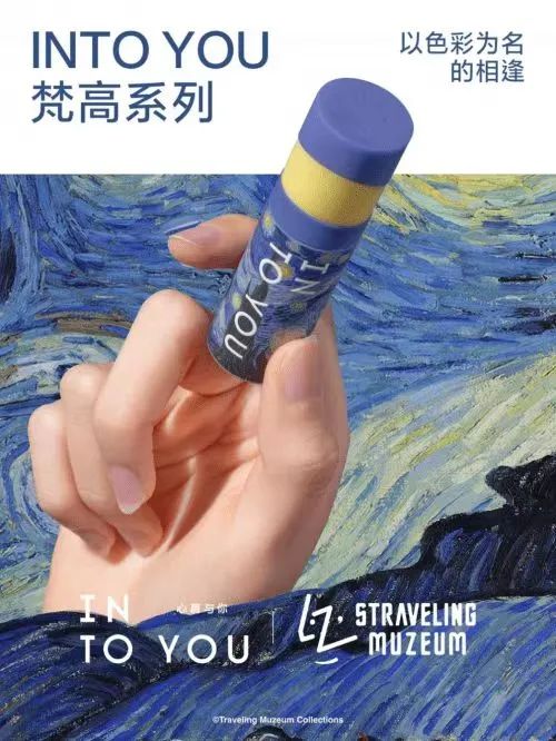 今年5月,新锐国货彩妆品牌INTO YOU以梵高的经典著作《星月夜》为灵感,将梵高的色彩特色应用于产品的主题和配色上,大面积的蓝色和点缀的黄色,大面积的蓝色与天空和水有关,能让我们冷静下来,达到平静宁静的情绪状态。