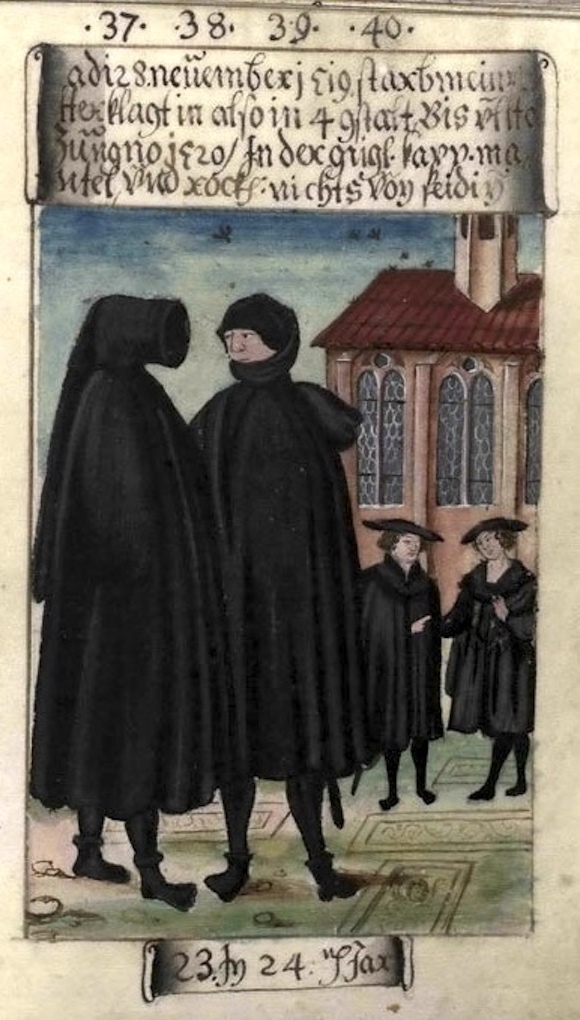 全书最后一张画像在1560年完成,描绘了Matthäus Schwarz参加老雇主Jakob Fugger侄子、更为富有的Anton Fugger的葬礼时的情景。可显然葬礼不是最主要的,当时已经63岁、并且罹患中风后遗症的Matthäus Schwarz身上的那套斗篷装才是主角。