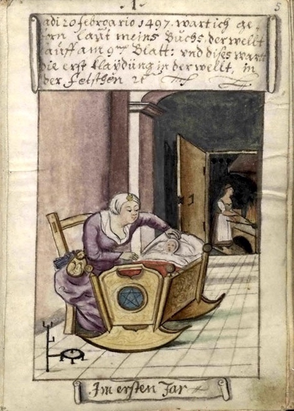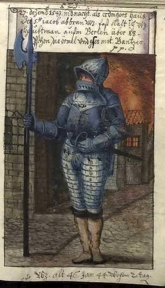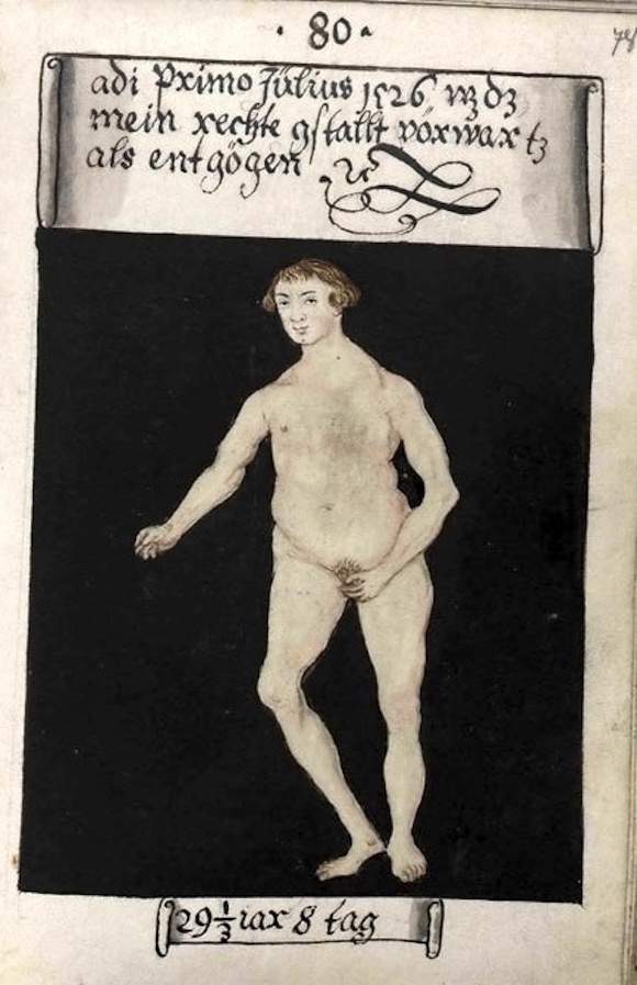 和如今我们的做法一样,他不单要记录造型的Lookbook,而是要有不同场合和背景下的“社交网络图”,所以你能看见穿着黑色丧服的Matthäus Schwarz在自己父亲葬礼上和外人私语、19岁时刚为Jakob Fugger工作时的青涩模样,26岁出差纽伦堡时身穿时髦装束的他正在望着大街上一条正在撒尿的狗、29岁由于感觉自己发胖而留下全裸图,甚至在他46岁时为了应对动乱战争而穿上的盔甲,都要记录在案——即便是自己根本毫无印象的襁褓时期,Matthäus Schwarz也会幻想出理想的场景,再口述给画师作画。