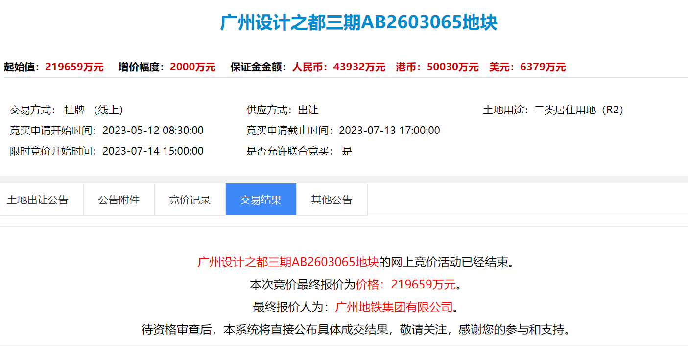 7月14日,广州设计之都三期AB2603065地块出让结果出炉,广州地铁集团有限公司以底价21.966亿元竞得该地块,成交楼面价26000元/平。