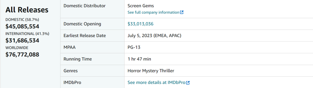 在北美,《潜伏5:红门》(以下简称《潜伏5》)首周末便斩获3301万美元,创下系列内部次高的开画成绩,成为暑期档首部夺冠的恐怖片;在海外,《潜伏5》也进账超过3千万美元,对比1600万美元的超低成本,预计将为索尼影业带来丰厚的回报。