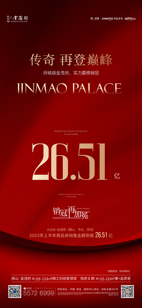 据克而瑞青岛数据统计,大云谷·金茂府项目以26.15亿总销售金额,荣获2023年上半年青岛销冠。