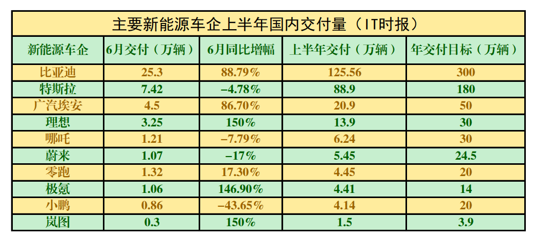 虽然交付量远远落后比亚迪,但得益于年初以来的多次降价,特斯拉成为新能源车企中距离年交付目标最接近的,达成率为49.4%。《IT时报》记者注意到,目前各大车企上半年交付量均未能超过年交付目标的50%。