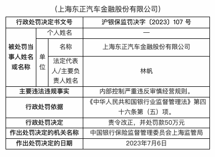 7月17日,国家金融监督管理总局公布的行政处罚信息公开表显示,2023年7月6日,上海东正汽车金融股份有限公司因内部控制严重违反审慎经营规则,被责令改正,并处罚款50万元。