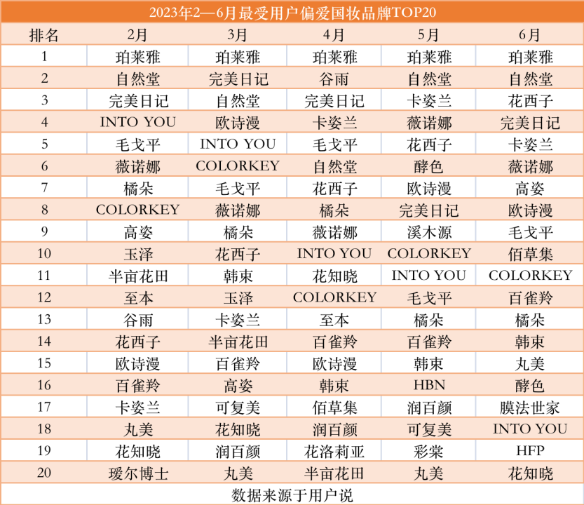 “用户说了”结合用户对品牌的态度、对品牌的热议偏好程度及对品牌官方账号的关注程度,每月对130个国货品牌做出综合评估,以此得出2023年2—6月“最受用户偏爱国妆品牌TOP20榜”。该榜单呈现出以下几大特点: