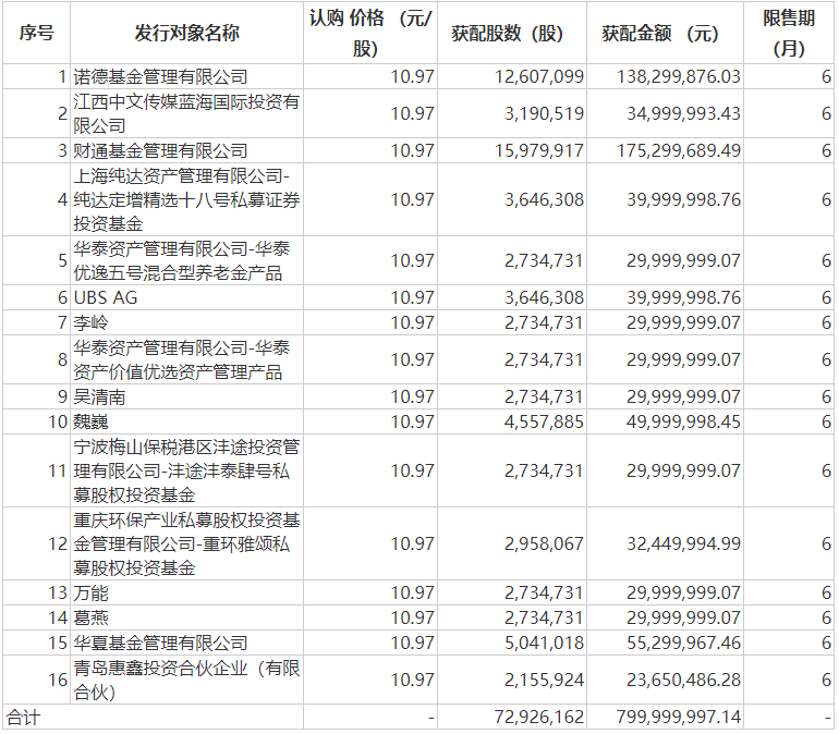 同和药业7月17日公告,截至2023年7月11日止,公司本次向特定对象发行A股股票实际已发行人民币普通股7292.61万股,每股发行价格10.97元,募集资金总额为约8亿元,本次发行对象最终确定为16名,其中,财通基金获赔金额1.75亿元,诺德基金获赔金额1.38亿元,华夏基金、魏巍、江西中文传媒蓝海国际投资等参投。
