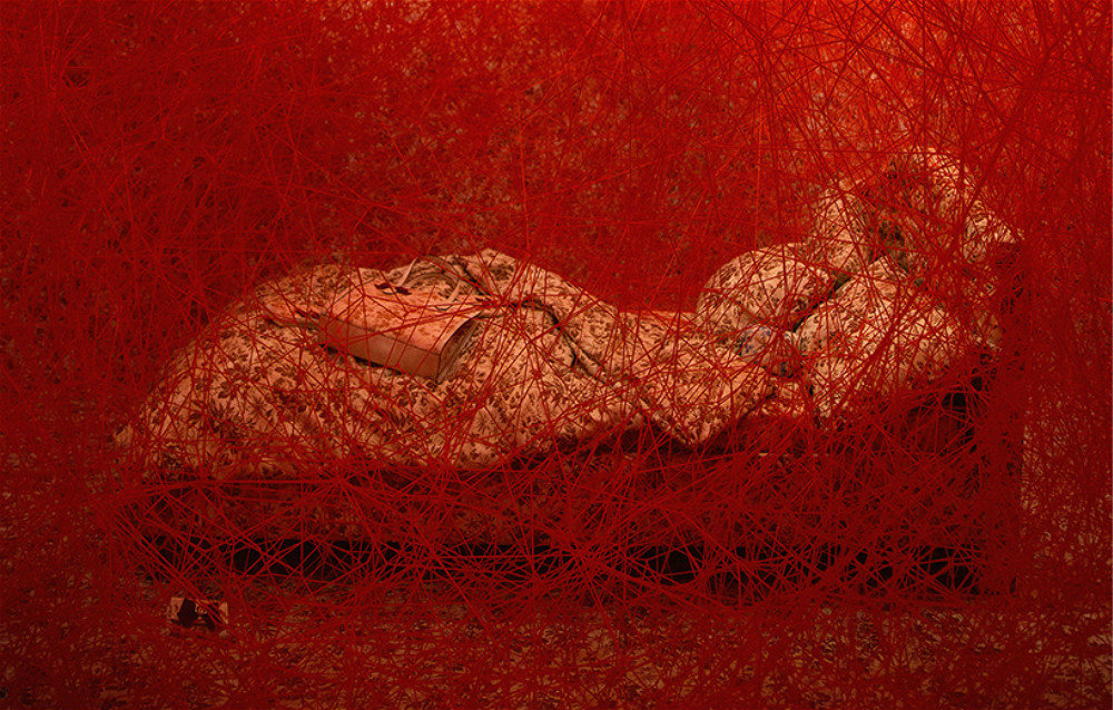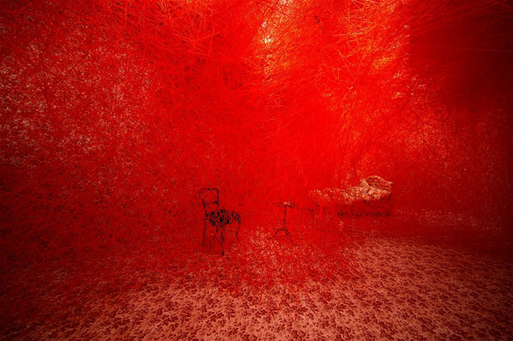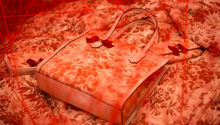 其中的Herbarium是欧美媒体报道最多的作品,它由日本艺术家盐田千春创作,这位常年旅居柏林的艺术家最擅长的是“创伤型艺术”。小的时候,盐田目睹过邻居家的大火,这段经历对她来说刻骨铭心。而在后来的创作中,盐田多次用烧过的东西布展,还喜欢用棉线把它们缠起来,以此构建出一种在痛苦中作茧自缚的压抑感。本次创作中,盐田也把Gucci的包袋、桌椅板凳、床缠在了密密麻麻的红色丝线中,远看像是枝枝蔓蔓的花丛,近看则像血管和人体神经,或是蜘蛛网,这种明媚又哀伤的气质和Michele的作品也很契合。