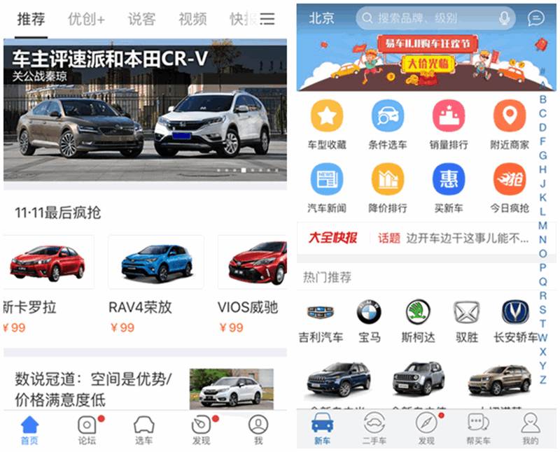 汽车之家(左)与汽车报价大全(右)app对比展示