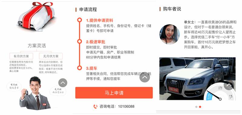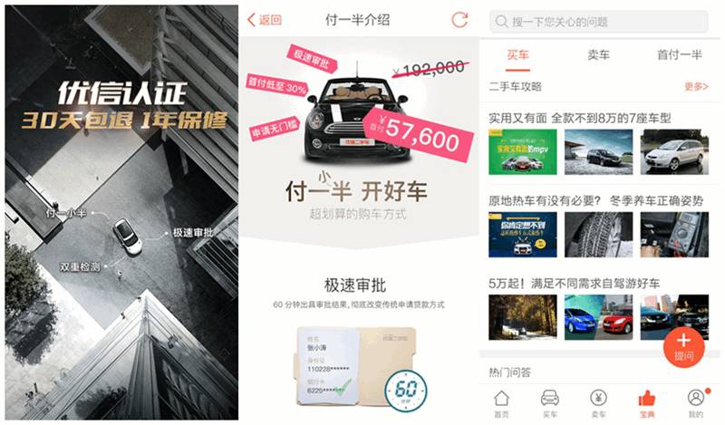 此外,优信还推出了金融产品“付一半”: 首付约车价的一半,两年内无月供用车,两年合约到期后,用户有两个选择,一是补齐尾款,完成车辆购买,相当于分期支付的贷款购车;二是不支付尾款,将车退还给优信,等于一个两年的租车方案。