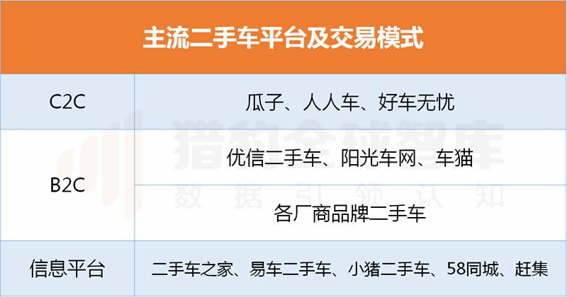 随着二手车市场体量不断壮大,各电商平台、汽车厂商也瞄准了这一市场机遇,各类二手车品牌、平台纷纷推出。目前,面对消费者的二手车平台主要为C2C、B2C与信息平台三类。各模式主要平台如下: