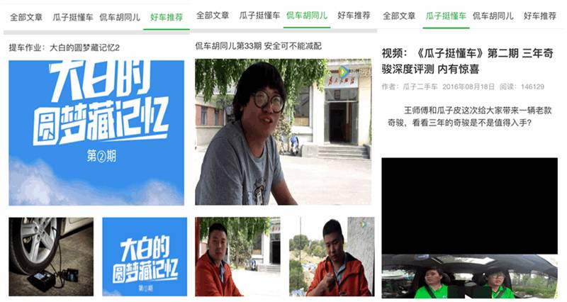 瓜子二手车的内容产品非常丰富,主要包含:瓜子挺懂车、看车胡同、好车推荐三档栏目,包含了图文游记与视频评测两种类型。