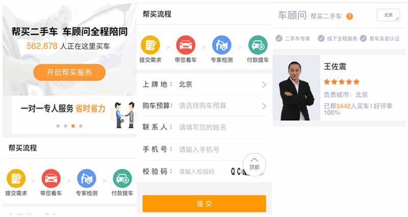 易车二手车推出“帮买二手车”服务,通过易车专业的车顾问团队根据用户的购车预算对用户进行一对一的顾问服务,为用户推荐预算内的车辆,并带用户完成现场看车,并提供专业的车辆检测服务,最终通过帮买车服务在平台完成购车。