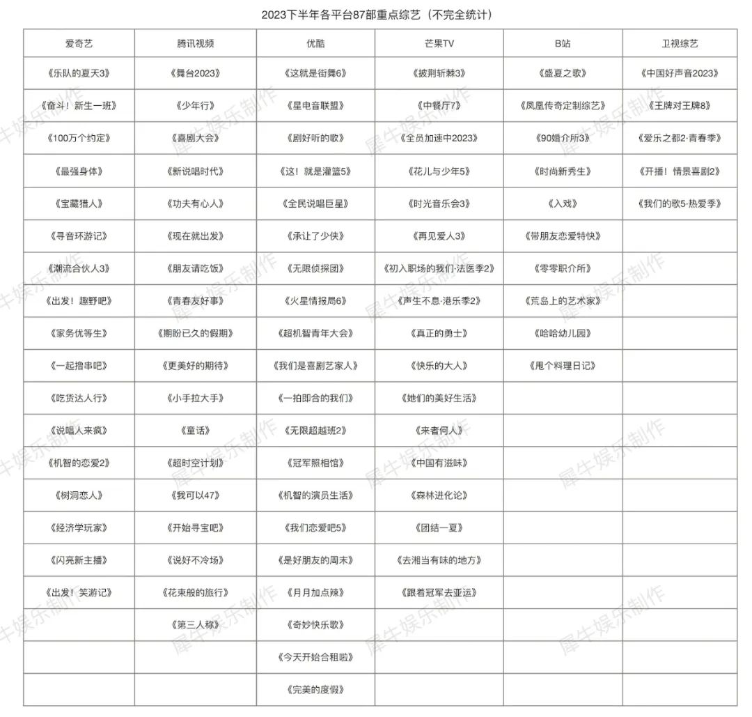 结合各平台片单和项目招商案,犀牛君这次梳理出了下半年爱优腾芒B和卫视布局的87部重点综艺,《乐队的夏天3》《舞台2023》《这就是街舞6》《披荆斩棘3》《盛夏之歌》《中国好声音2023》将要领衔下半年的头部S+大战。