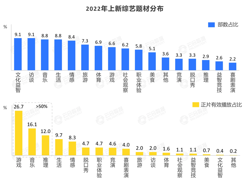 云合数据显示,2022年上新音乐类综艺有效播放市占比16.1%,仅次于游戏类综艺位居市场TOP2。但需要注意是,游戏类综艺的上新部数市占比仅为6.6%,有效播放市占比位于TOP3的推理类综艺更只有2.9%,而上新音乐类综艺达8.8%。