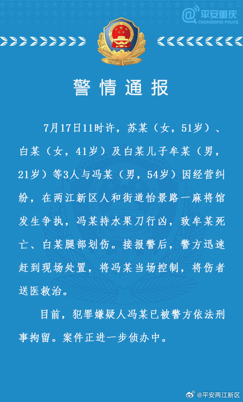 @平安两江新区 微博发布警情通报,7月17日11时许,苏某(女,51岁)、白某(女,41岁)及白某儿子牟某(男,21岁)等3人与冯某(男,54岁)因经营纠纷,在两江新区人和街道怡景路一麻将馆发生争执,冯某持水果刀行凶,致牟某死亡、白某腿部划伤。接报警后,警方迅速赶到现场处置,将冯某当场控制,将伤者送医救治。