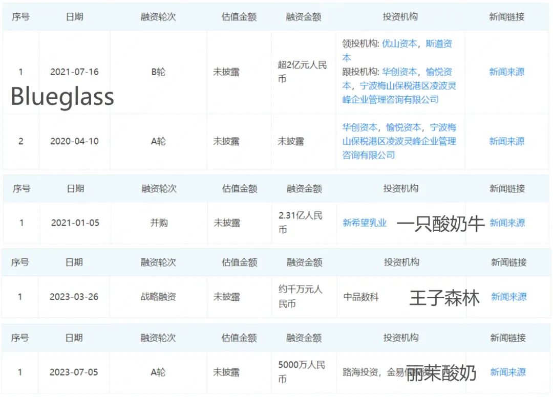 2021年,Blueglass获得超两亿元的B轮融资,新乳业以2.31亿元的价格收购了一只酸奶牛,即使是在新消费融资沉寂的2023年,也先后有王子森林、丽茉酸奶获得融资。