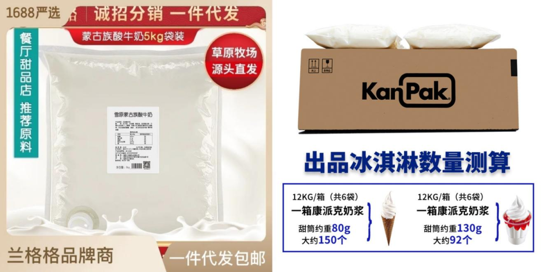 左:兰格格蒙古族酸牛奶 右:康派克冰淇淋奶浆,图源:1688