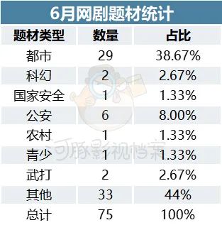 从题材上来看,6月备案的网剧类型丰富,涵盖了都市、科幻、国家安全等多种题材类型。其中,现实题材仍然占据了主导,占据了64%。都市题材占比有所提升,共29部;科幻题材2部;国家安全题材1部;公安题材6部;青少题材1部;武打题材2部;其他题材33部。