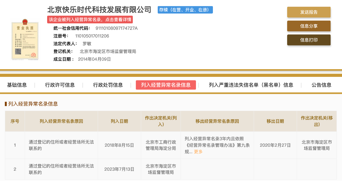 近日,国家企业信用信息公示系统显示,北京快乐时代科技发展有限公司因通过登记的住所或者经营场所无法联系,于7月13日被北京市海淀区市场监督管理局列入经营异常名录。