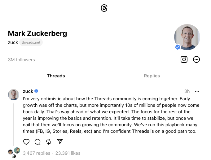 北京时间7月18日,Meta首席执行官马克·扎克伯格通过Threads发文称,目前每天都有数千万用户回访Threads社区,这远远超出了他们的预期。扎克伯格称,“今年剩余时间的重点是提升基础量和留存率。稳定下来需要时间,但一旦做到这一点,我们就会专注于发展这一社区。”