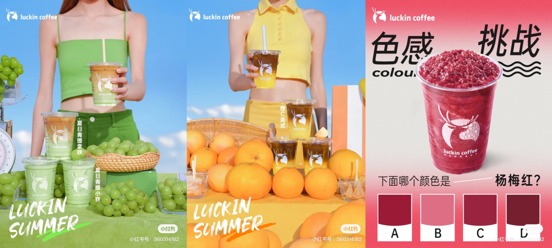 6月14日,瑞幸咖啡率先提出“多巴胺冰咖”概念,在现有产品矩阵中,选择色彩不同的六款果咖组成“多巴胺冰咖”系列,既有冰咖橙C美式撞明亮橙也有青提拿铁撞清新绿,并搭配对应色系拍摄全新宣传图,稳稳拿捏了“多巴胺”风格的精髓。在近日,瑞幸还在小红书上发起“色感挑战”,加深与用户的色彩互动,拉满多巴胺氛围。