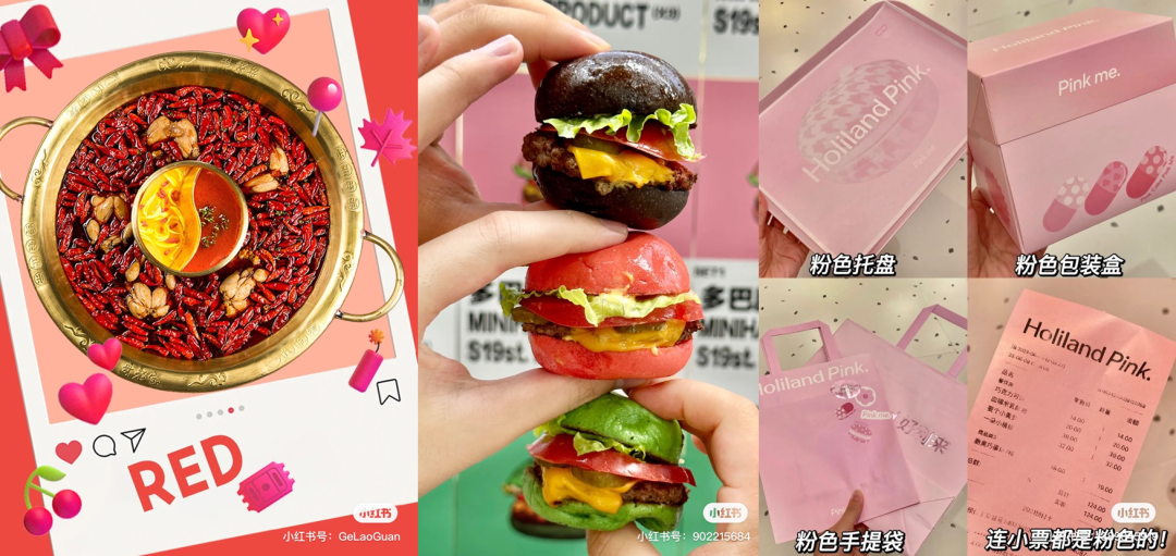 哥老官则转行做起美食博主,将锅底红、啤酒黄、毛肚黑、腰片粉、黄喉白等食材集合,凑齐一桌“多巴胺火锅”。汉堡品牌S19st.食個堡推出“多巴胺mini汉堡”,将面包胚换成黑色、红色、绿色的,激发消费者打卡试吃的兴趣。