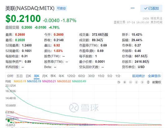 受此消息影响,美联股价盘前上涨17.99%。然而当日开盘,股价却一路震荡下滑,收盘翻绿,股价继续在0.2美元左右徘徊。