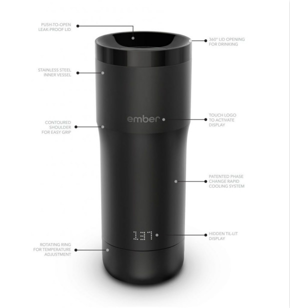 不久前,Ember 科技公司通过众筹发布了这款产品,通过充电,它能保持温度,还能精确调节温度,范围在 120°F~150°F(48°C~66°C)之间。这家公司的 CEO Clay Alexander 谈到: