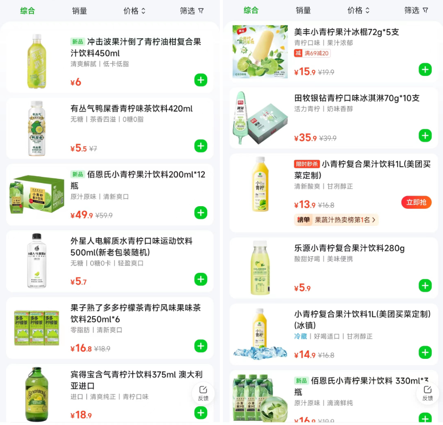 到了2023年初夏,笔者再次发现美团买菜等平台上小青柠口味的产品仿佛在一夜之间都上架了,从饮料到冰品一应俱全,这一次也有了更多新面孔。
