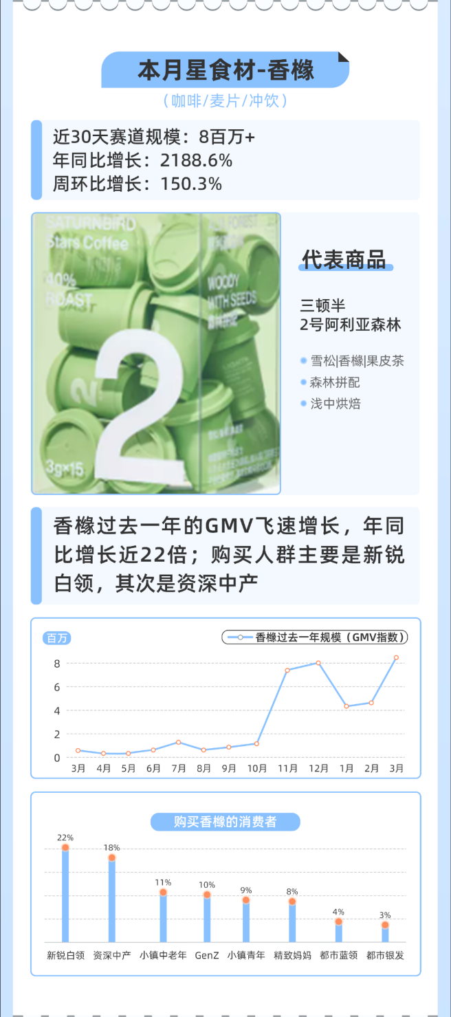 不仅是小青柠,香橼也在2023年崭露头角。根据2023年的《TMIC美食趋势洞察 · 三月》数据显示,香橼(佛手柑是香橼的变种)在2023年3月年同比增长2188.6%,主要购买人群是新锐白领,其次是资深中产。