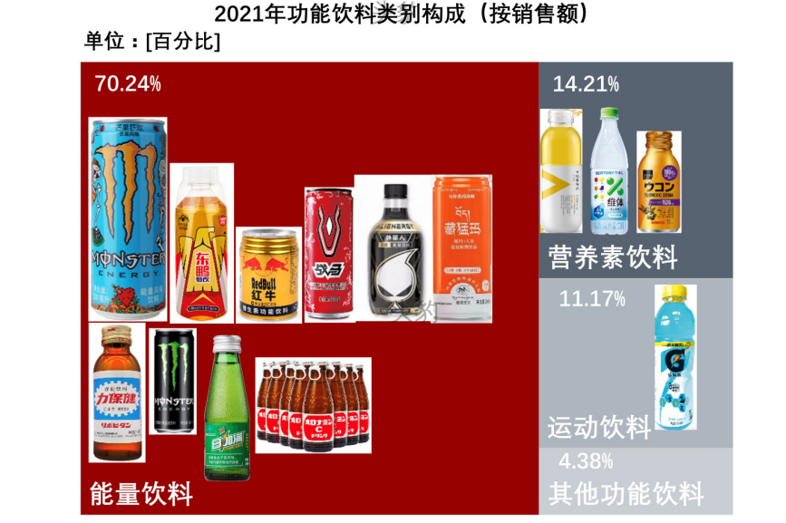 另一种被关注的健康方向就是功能性饮料,而能量饮料则是其中增速最快、销量最好的子品类。2021年,能量饮料在功能饮料销售量占比达70.24%。