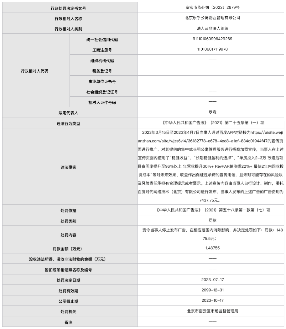 北京市场监管局网站显示,7月17日,北京乐乎公寓物业管理有限公司因违反广告法,被北京市密云区市场监督管理局责令停止发布广告,并罚款1.48万余元。处罚事由显示,当事人在招商宣传页面使用了“稳健收益”、“长期稳健盈利的选择”、“单房投入2-3万……最快2年内回收投资成本”等对未来效果、收益作出保证性承诺的宣传用语,且未对可能存在的风险以及风险责任承担有合理提示或者警示。