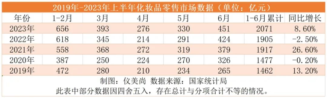 不过,从单月数据来看,2023年1-2月、3月、4月、5月和6月,均创下近5年新高,同比增长分别达到38%、14%、29%、13和6%。若按累计数据看,今年3月-6月,化妆品类零售则分别同比增长9.6%、24.3%、11.7%。