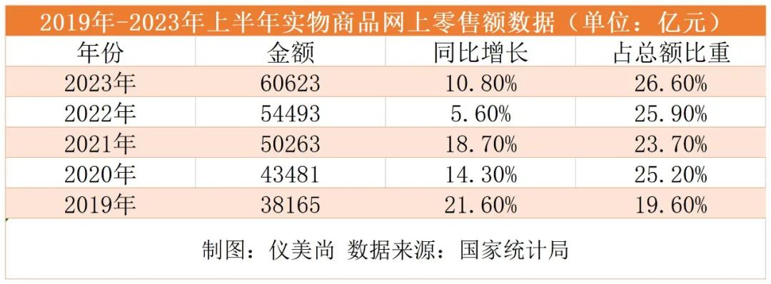 仪美尚统计了2019年-2023年上半年的实物商品网上零售额发现,近5年上半年,网上零售占社会消费品零售总额的比重逐年上升,从19.6%跃升至26.6%。