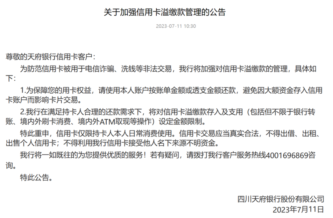 该公告指出,天府银行限制信用卡溢缴款的主要原因是为了防范信用卡被用于电信诈骗、洗钱等非法交易。