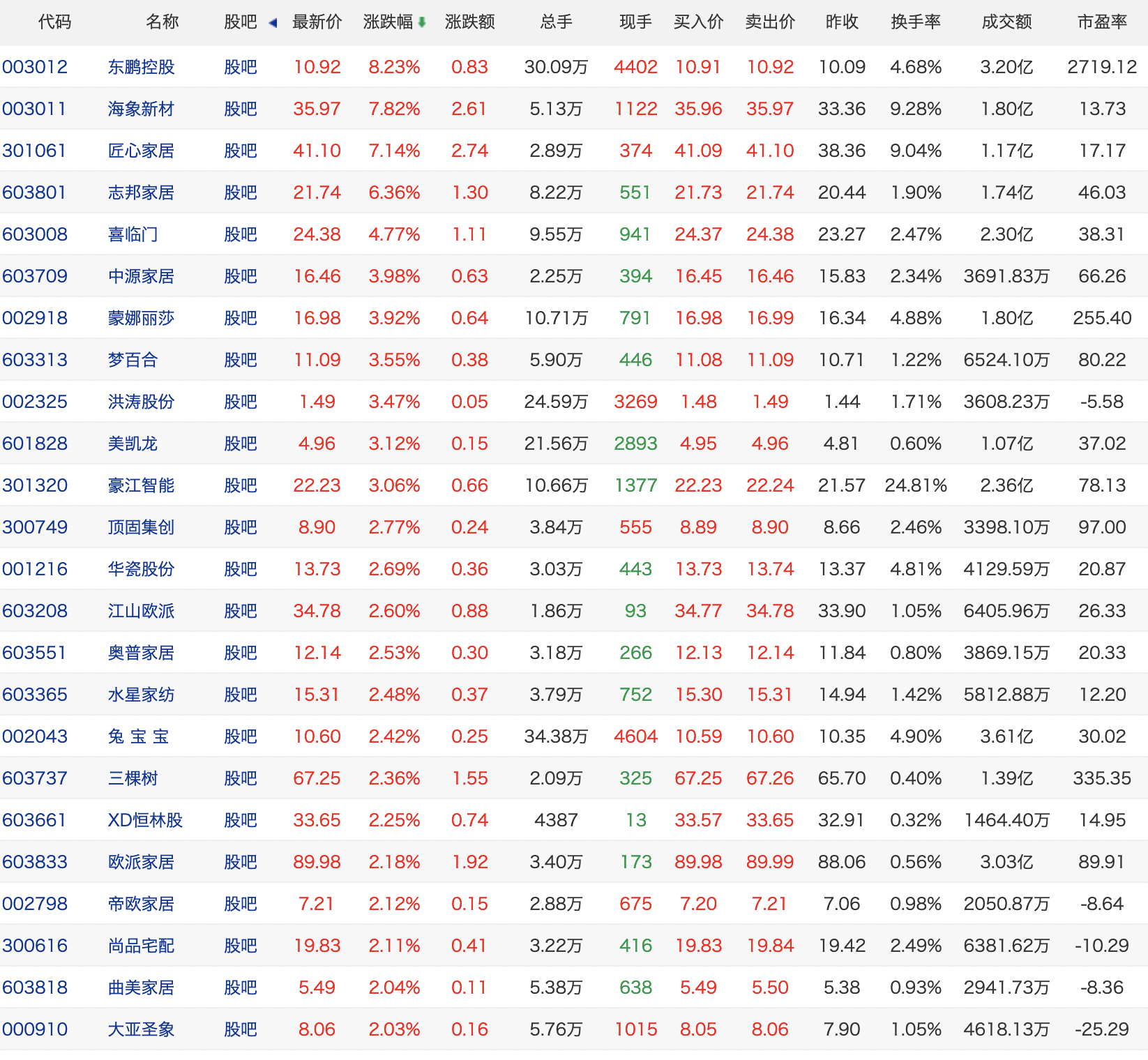 反映到二级市场上,近日促家居消费措施发布后,家居板块迎来拉伸,不过仅东鹏控股(003012.SZ)、海象新材(003011.SZ)、匠心家居(301061.SZ)、志邦家居(603801.SH)日涨幅超过6%,截止收盘分别报价10.92元/股、35.97元/股、41.1元/股、21.74元/股。